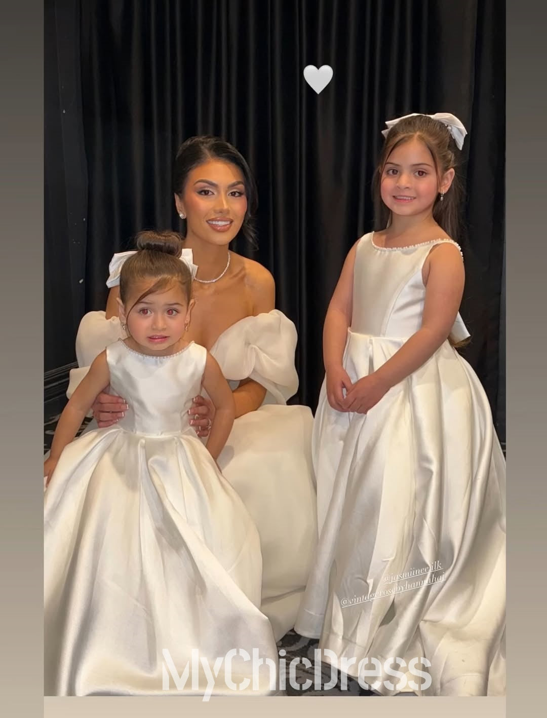 This satin flower girl dress features delicate pearl-adorned straps and a charming bowknot at the back, combining elegance and comfort. Its sleeveless design allows ease of movement, making it ideal for special occasions. The smooth satin fabric lends a refined shine while the thoughtful details ensure a graceful look for any young participant. Perfect for weddings, parties, or formal events, this dress balances style and functionality with expert tailoring.