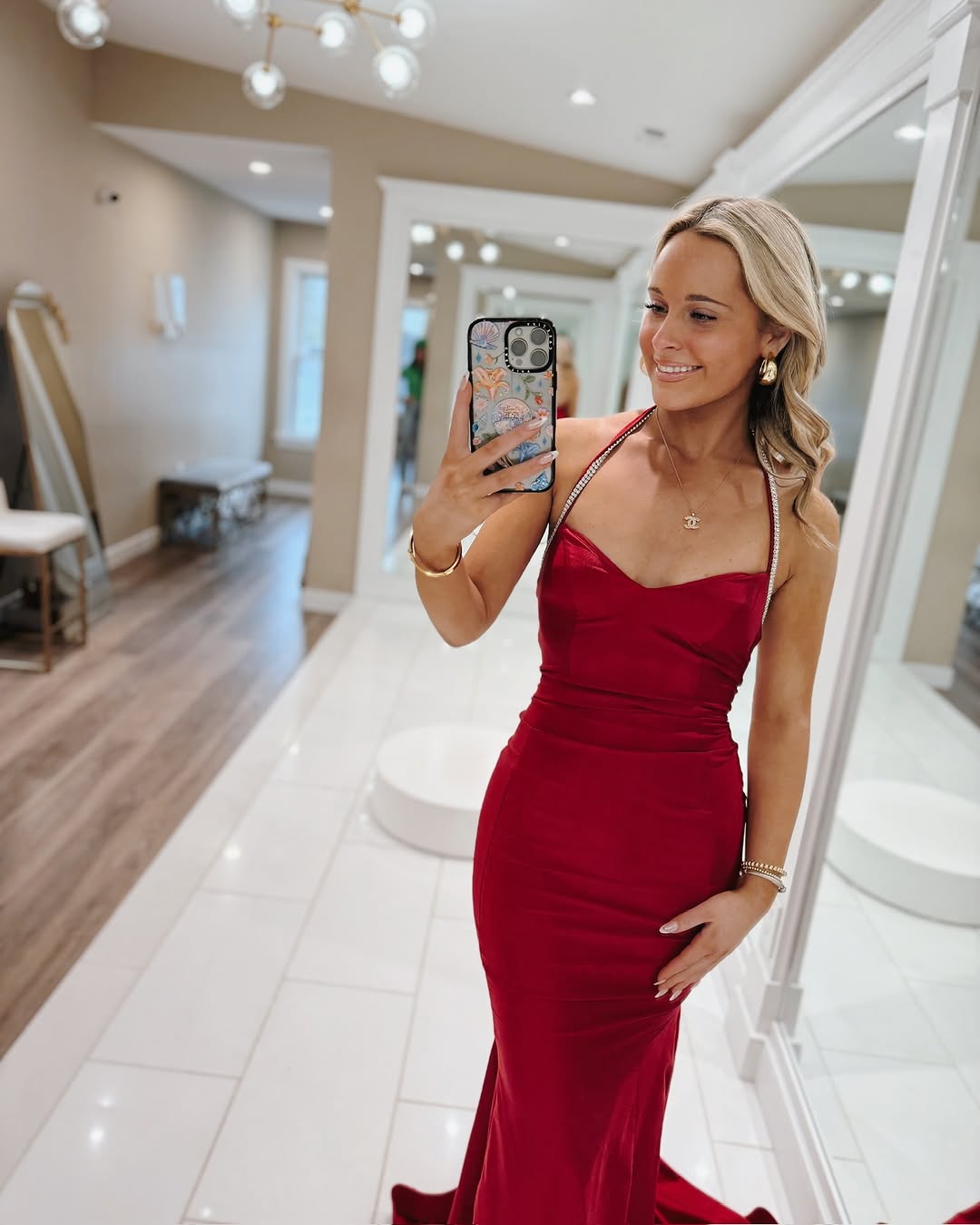 Indulge in the luxuriously satin fabric and breathtaking emerald green hue of this sexy formal dress. The halter neckline and open back add a touch of alluring charm, while the mermaid silhouette and flowing skirt create a stunning silhouette. Perfect for prom or any formal event.